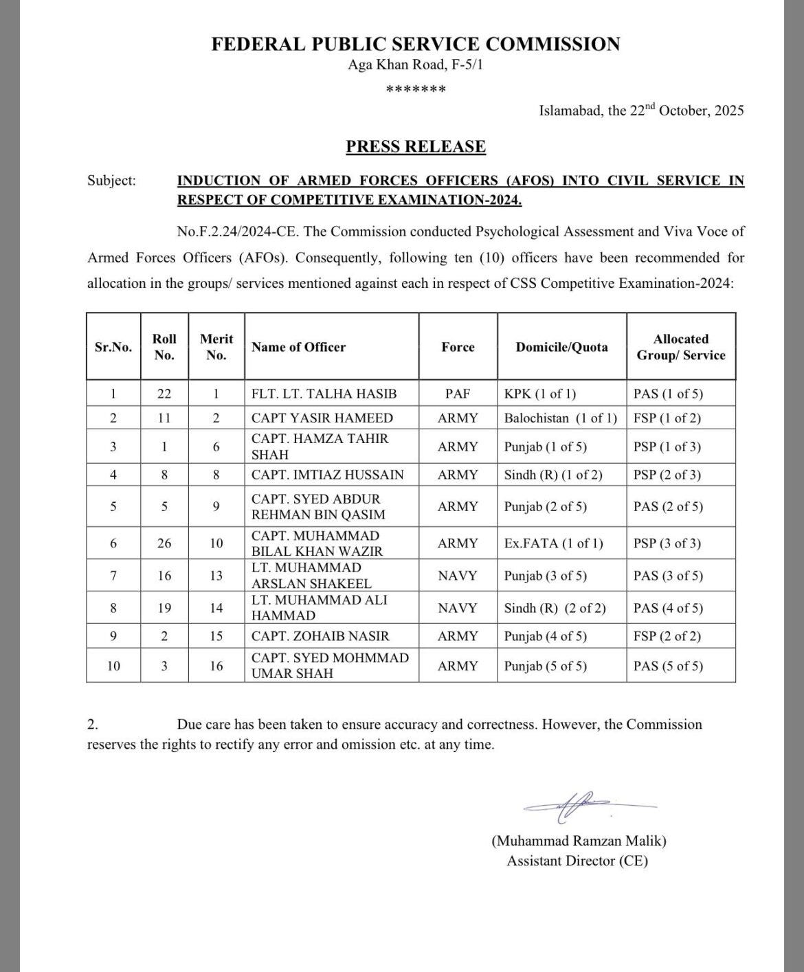 The announcement dated 22 October 2025, available on Federal Public Service Commission (FPSC) website, lists ten armed forces officers recommended for various groups under the CSS Competitive Examination 2024. Captain Syed Abdul Rehman Bin Qasim, from Pakistan army, has been assigned to the Pakistan Administrative Service (PAS) under the Punjab quota.
